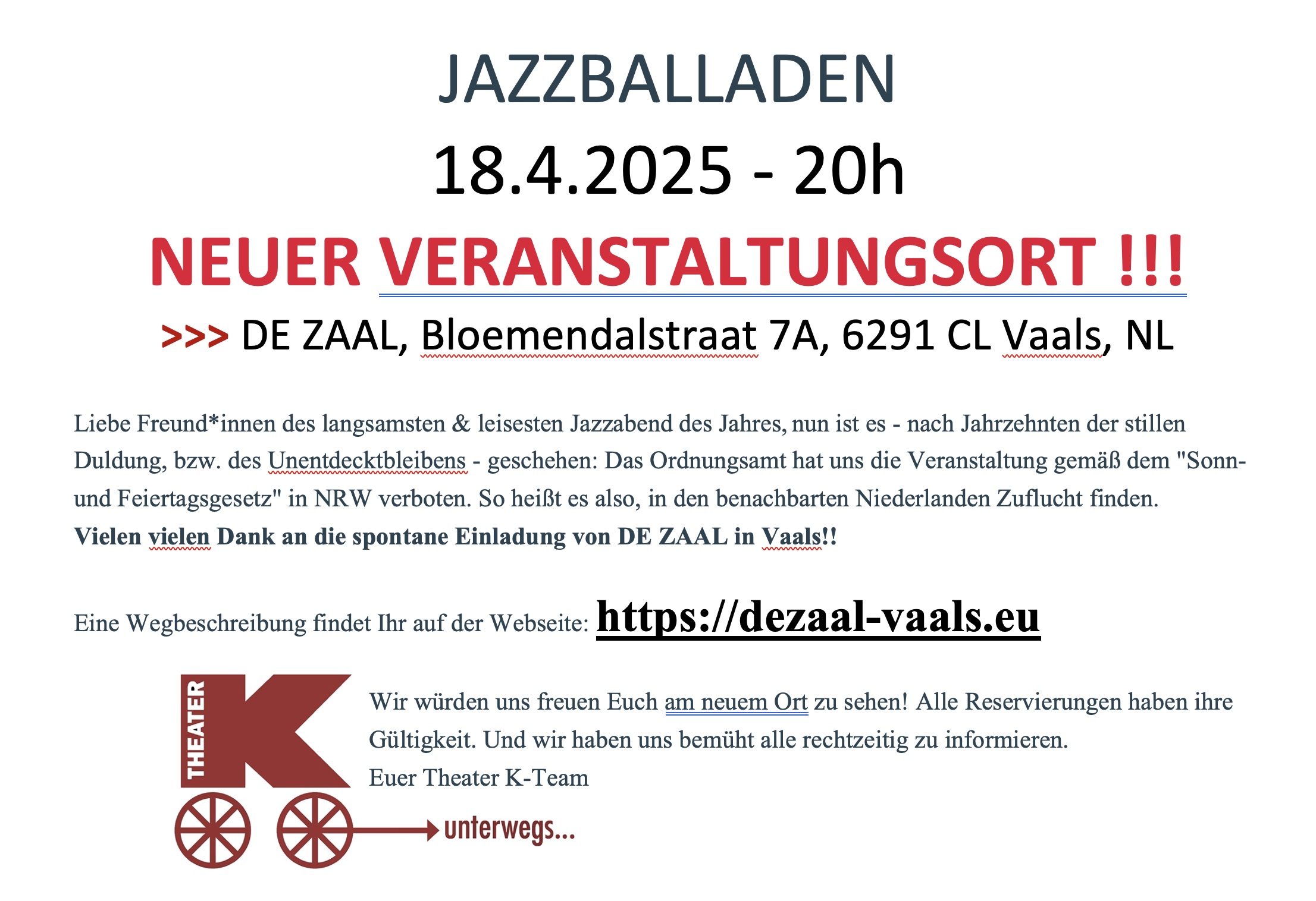 Dieser langsamste und leiseste Jazzabend des Jahres findet schon seit mindestens 10 Jahren immer, und nur an Karfreitag statt. Angefangen hat es als Duo mit Anirahtak & Jürgen Sturm mit wechselnden Gästen (u.a. Werner Lauscher - Kontrabass; Hans Günter Eisele -  Schlagzeug; Heribert Leuchter - Altsaxophon; Lothar Galle-M. - Bass) im legendären 'Café Opera' auf der Heinrichsallee in Aachen. Nachdem aber Jupp Beyer das  Handtuch geworfen hatte und das 'Café Opera'  schließen musste, waren die Jazzballaden plötzlich heimatlos. Zum Glück fand sich bald ein idealer neuer Ort, das Foyer Rouge im Theater K.